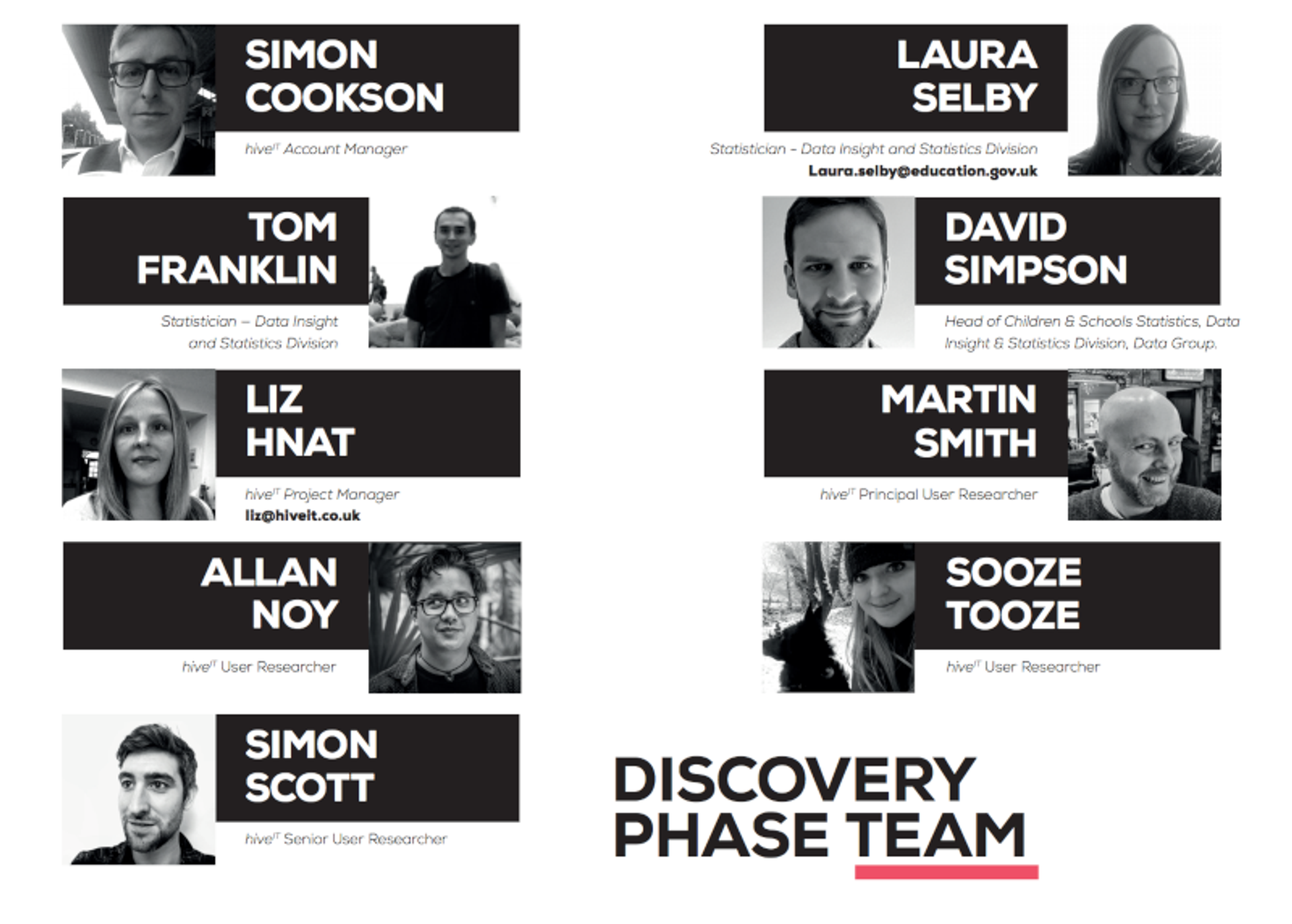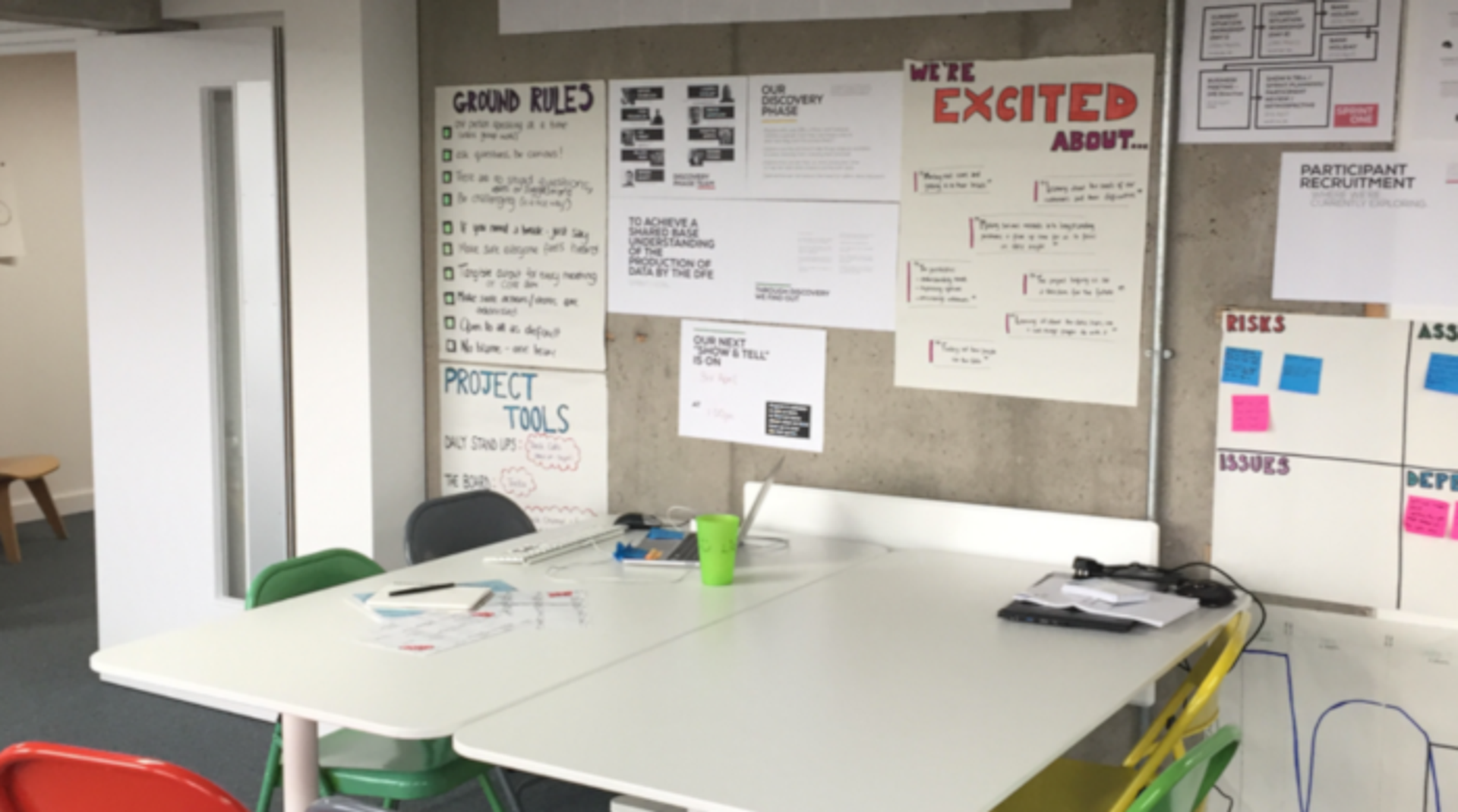 The project was run using the GDS (Government Digital Service) agile methodology for Discovery projects, working in weekly sprints. As part of the project, we set up ‘Project Hubs’ at both our Hive IT offices and the Sheffield and Darlington DfE offices for visibility and to encourage engagement from other DfE departments and teams. They were regularly updated with information as we moved through the project.