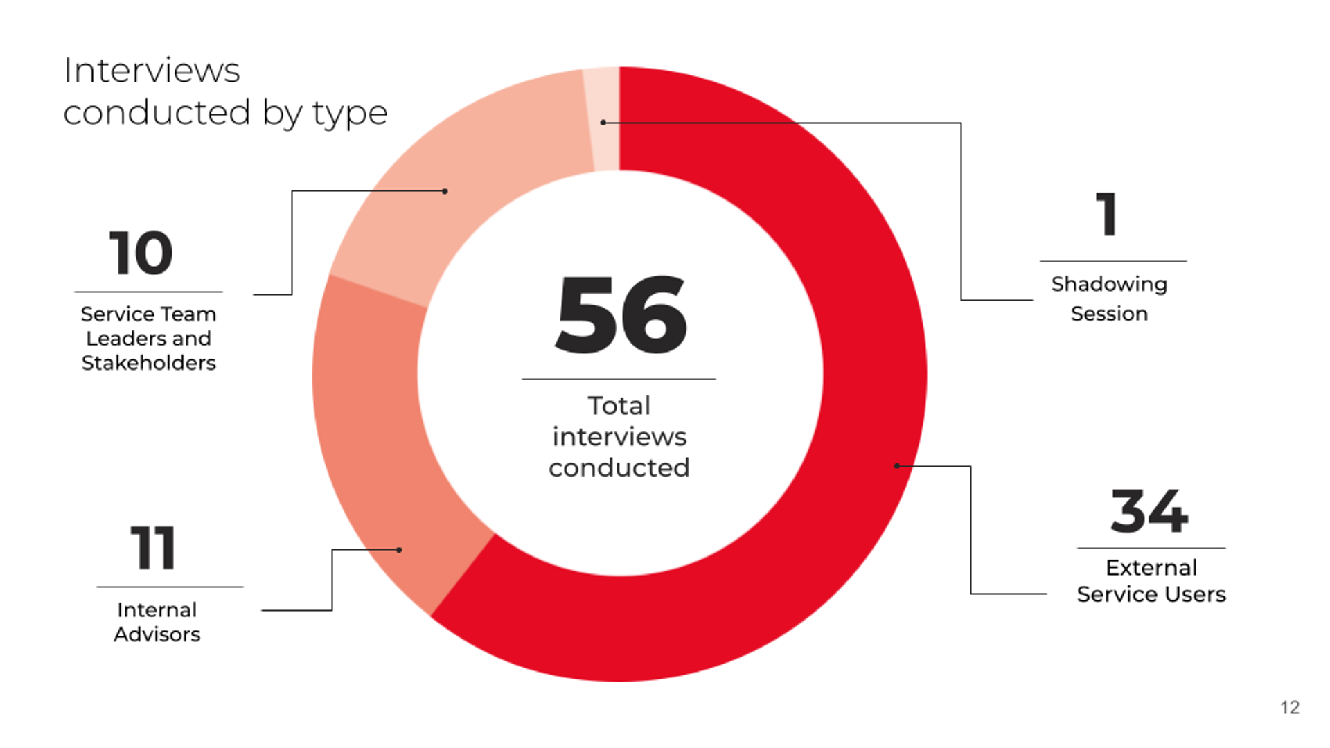 We also wanted to know what challenges they currently faced and how the different channels integrate together and connect up. In total, we interviewed 10 Service Team Leaders and Stakeholders.